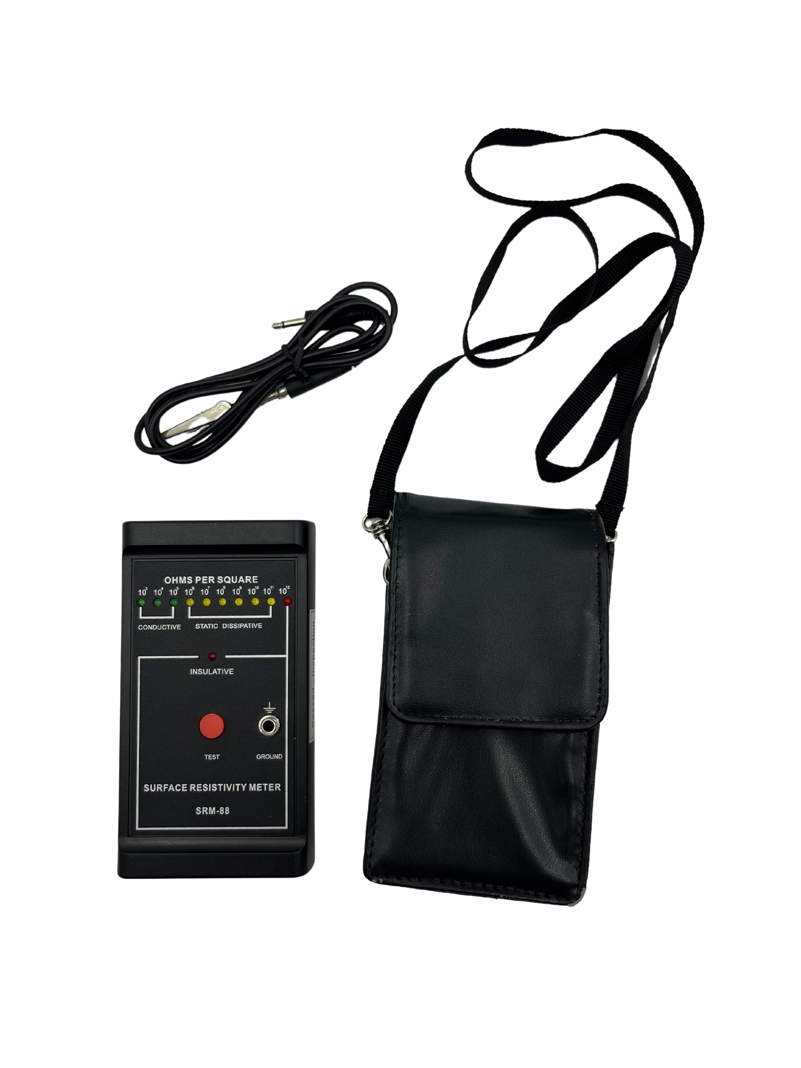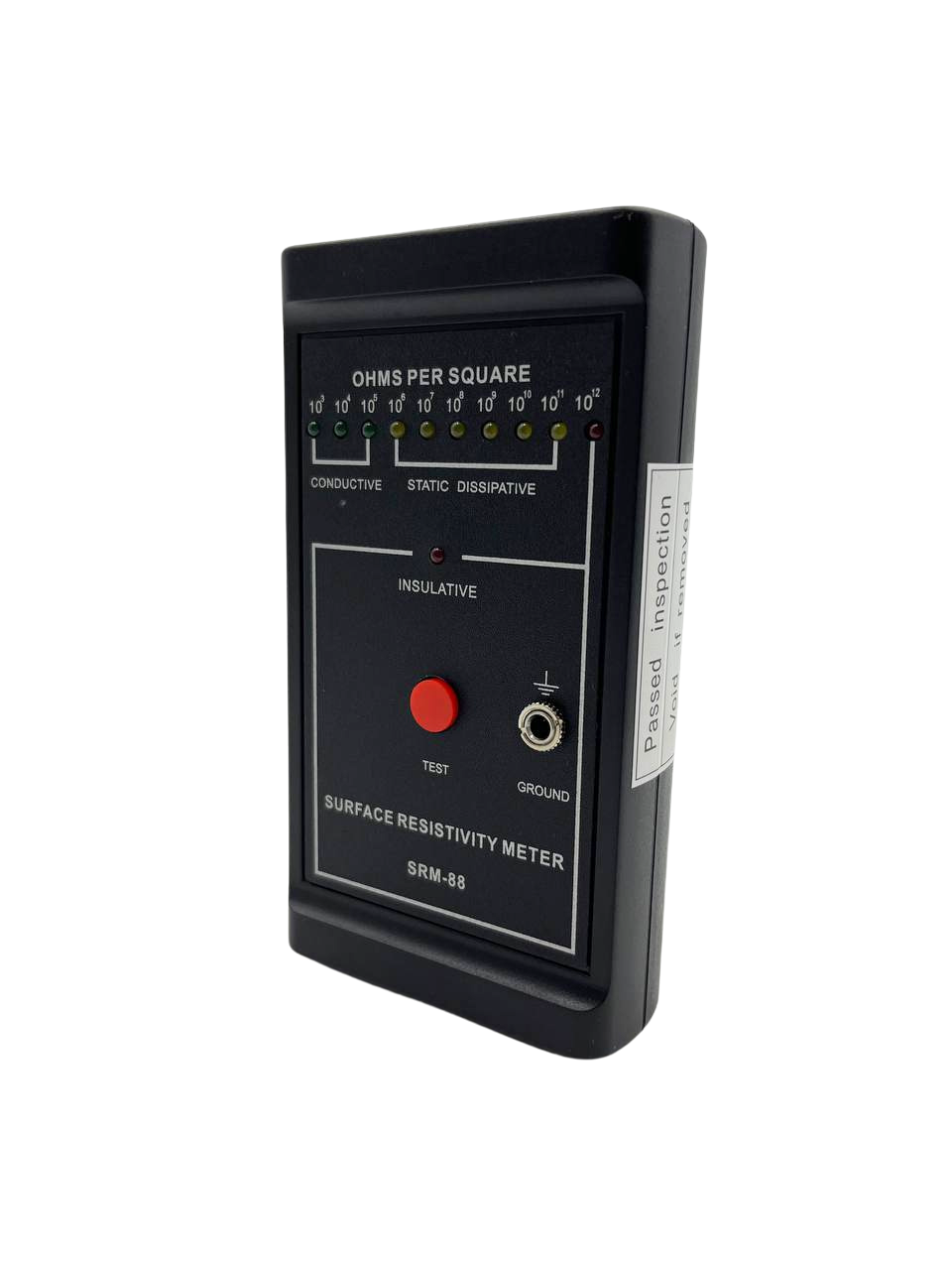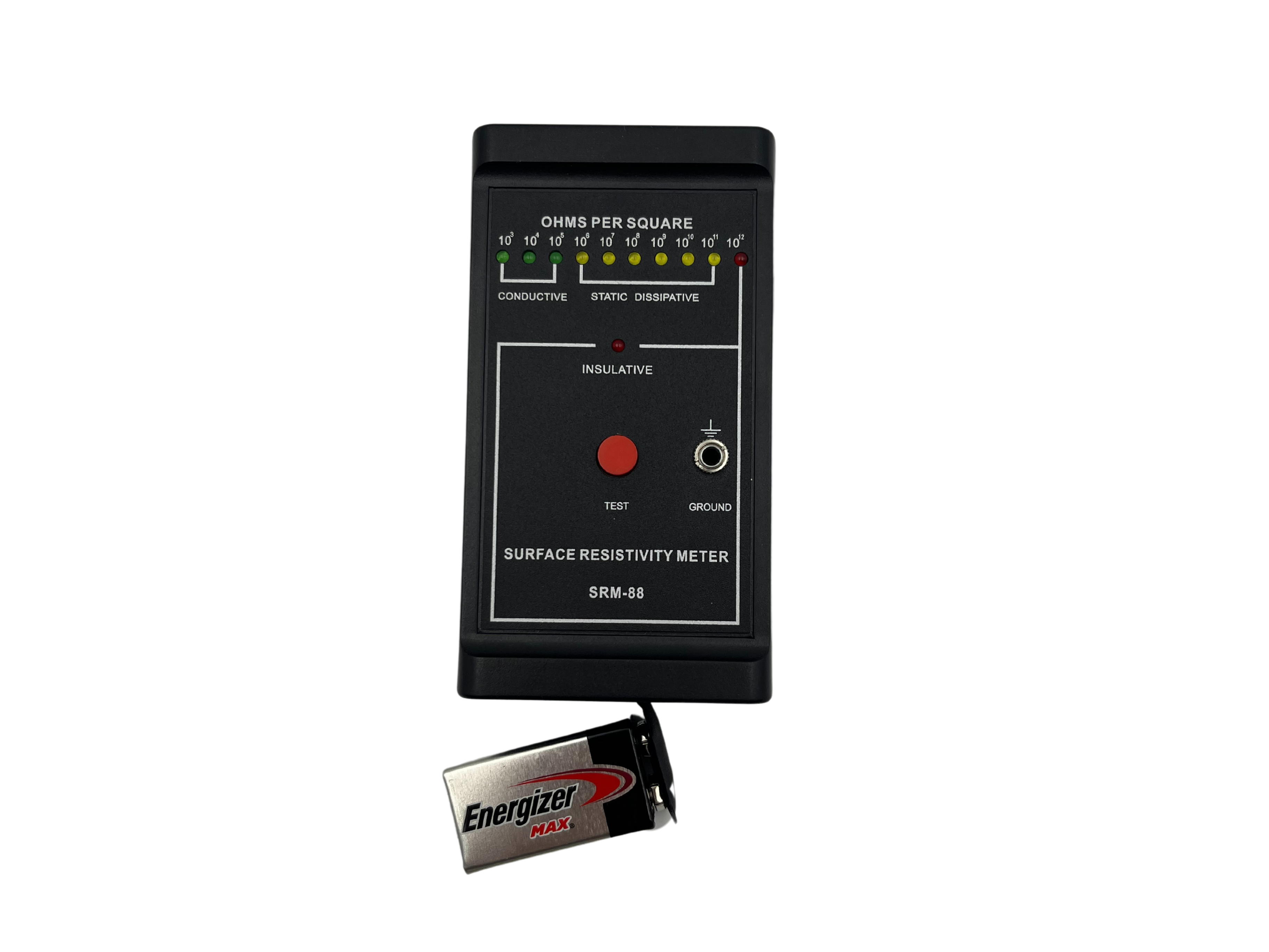 - Press the green test button. The meter will then light the appropriate LED from 10 to the power of 3 to 10 to the power of 12 Ohms per square or insulative.